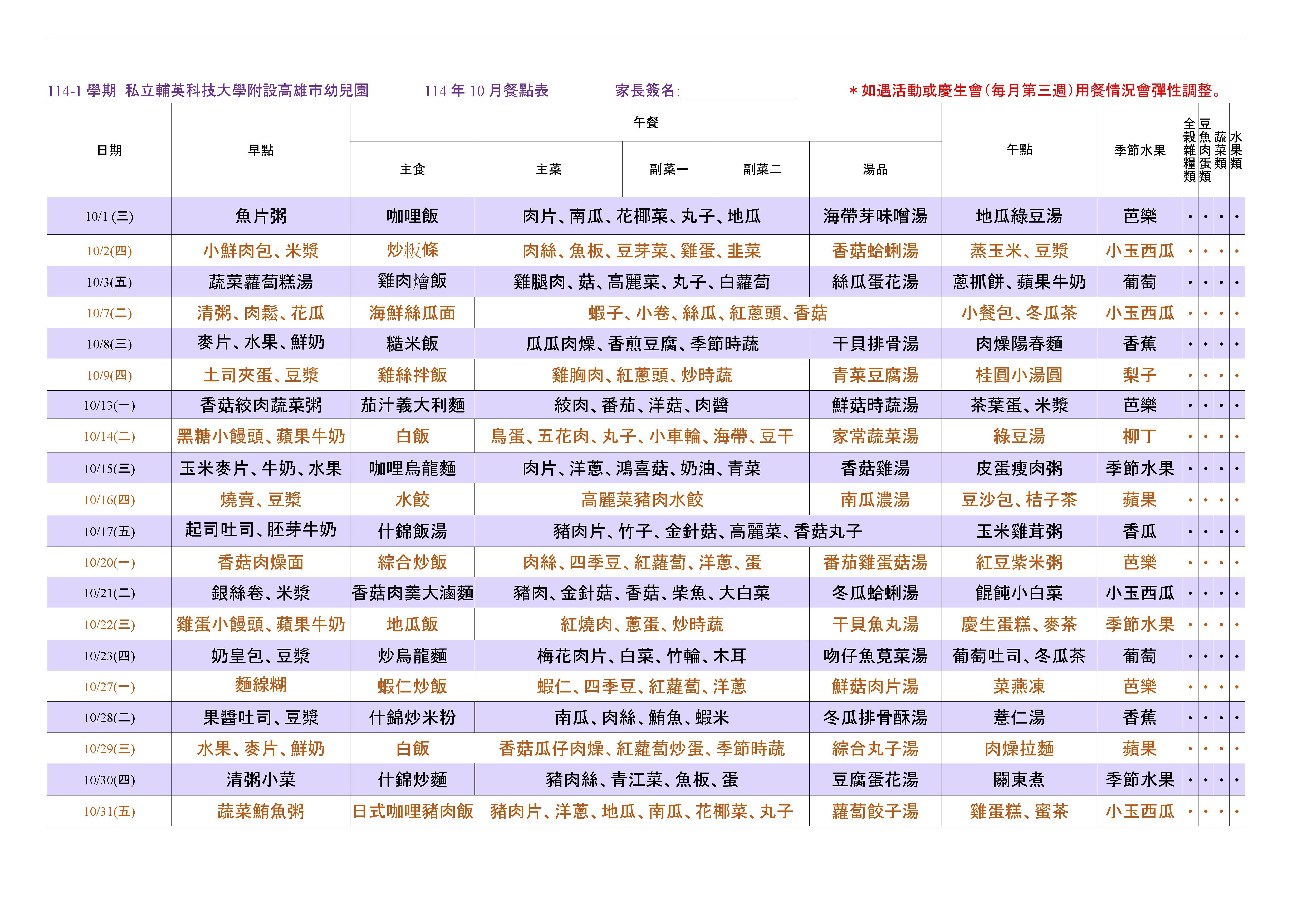 私立輔英科技大學附設高雄市幼兒園10月餐點表