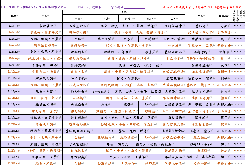 私立輔英科技大學附設高雄市幼兒園12月餐點表