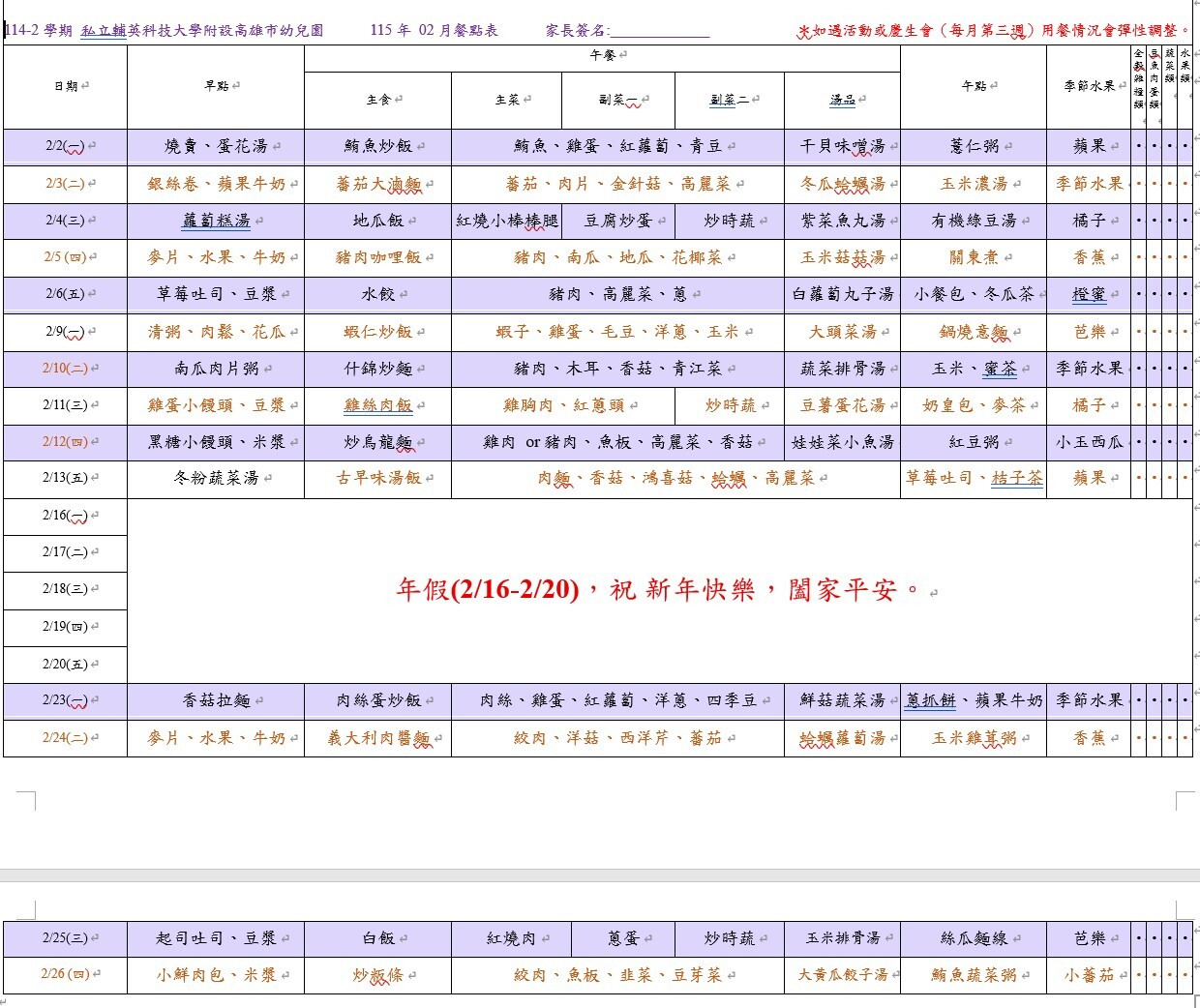 私立輔英科技大學附設高雄市幼兒園114學年度第二學期2月餐點表